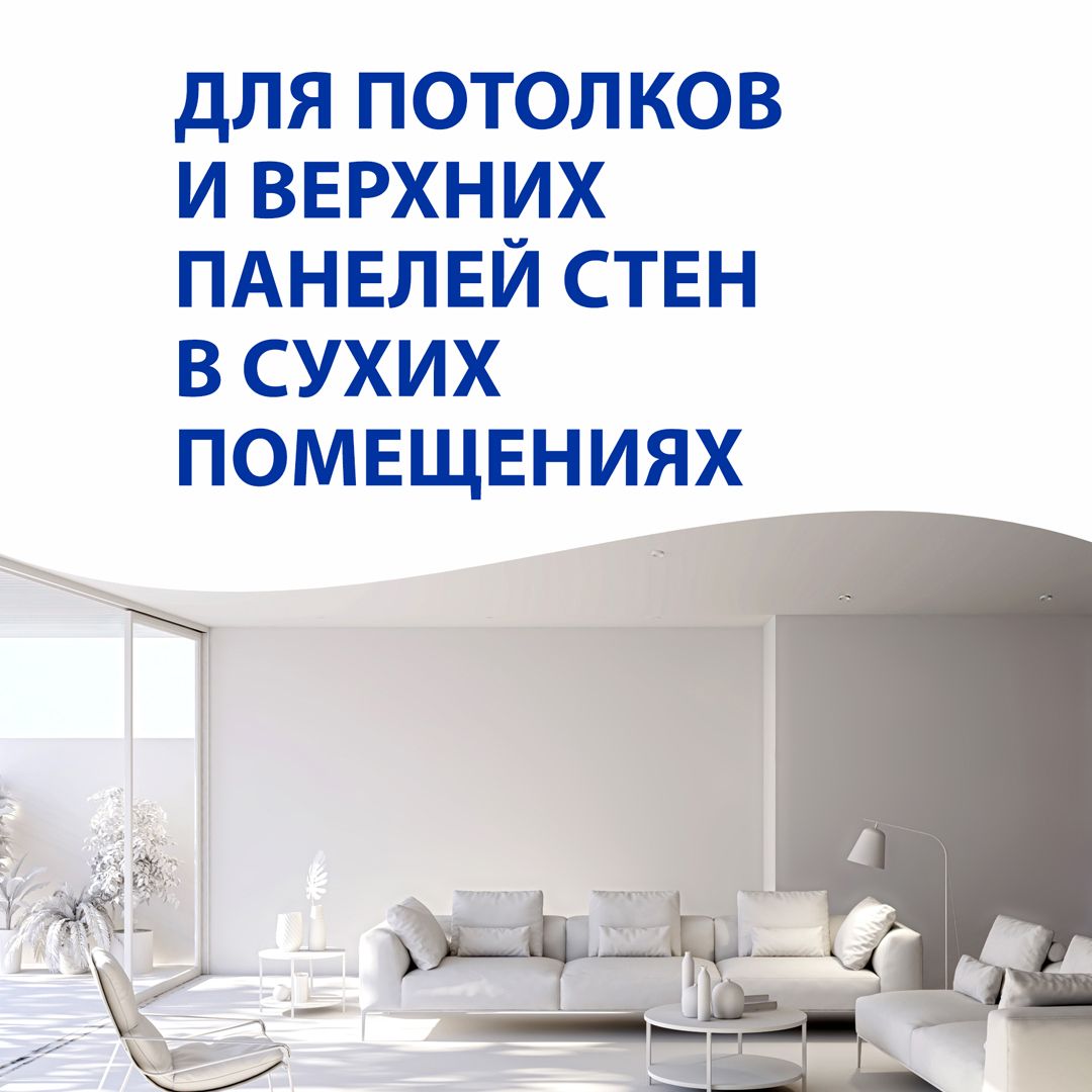 Для потолков и верхних панелей стен в сухих помещениях. Применяется по ранее неокрашенным или окрашенным водно- дисперсионными красками минеральным поверхностям: бетону, газобетону, асбоцементу, штукатуркам, шпатлевкам, кирпичной кладке, а так же по поверхностям, оклеенным различными рулонными отделочными материалами. Сертифицирована для детских и медицинских учреждений