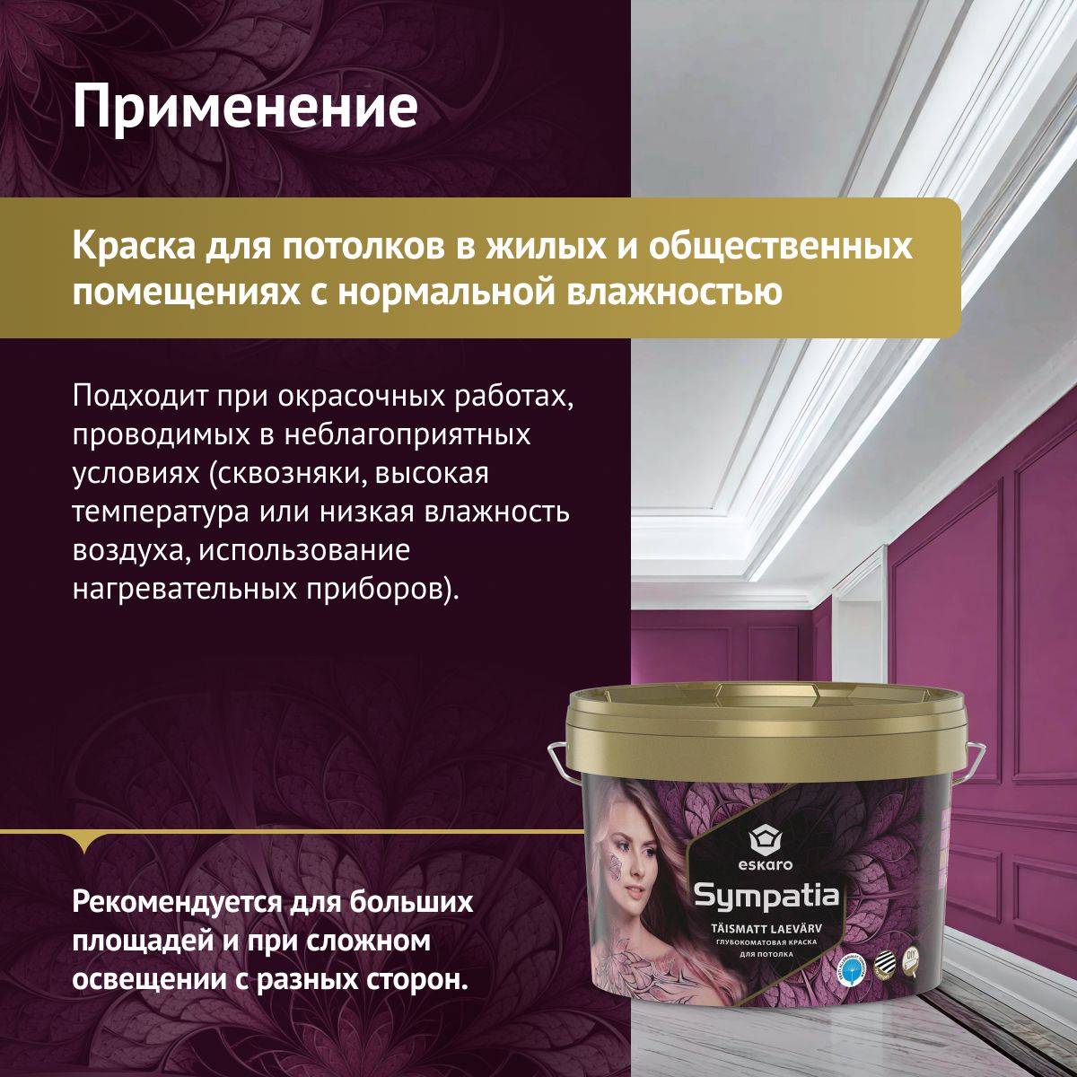 Первичная и ремонтная окраска потолков в жилых и общественных помещениях с нормальной влажностью. Рекомендуется при окрасочных работах, проводимых в неблагоприятных условиях (сквозняки, использование нагревательных приборов, высокая температура или низкая влажность воздуха), а также при окраске больших площадей с особенностями освещения (длинные коридоры, боковое освещение).