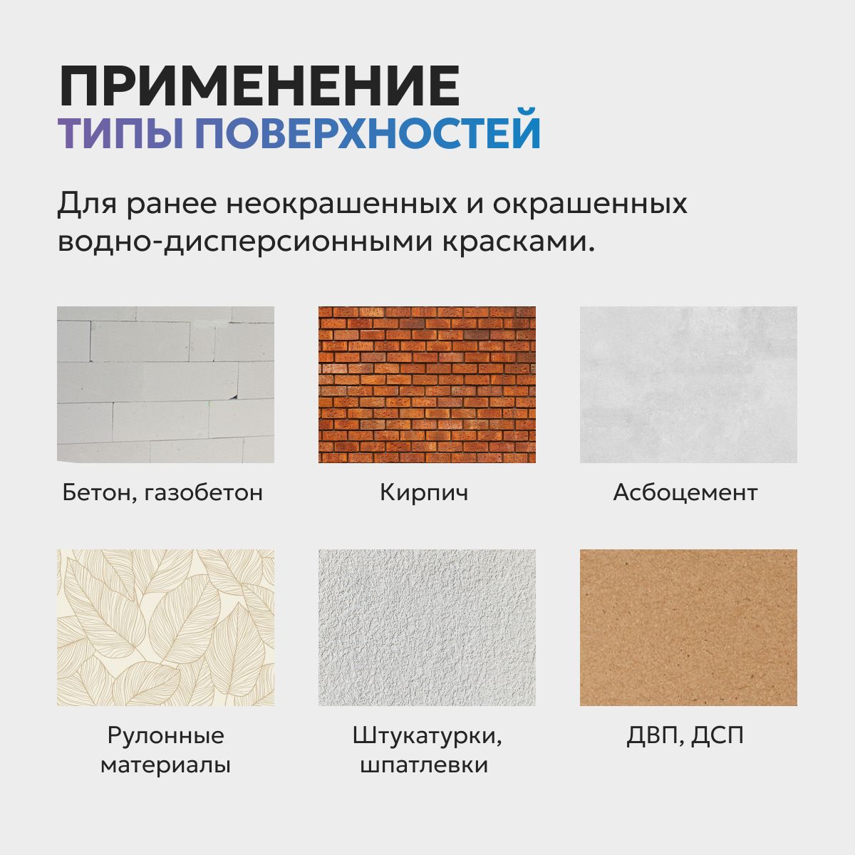 Применяется по раннее не окрашенным или окрашенным водно-дисперсионными красками поверхностям: бетону, газобетону, асбоцементу, штукатуркам, шпатлевкам, кирпичной кладке, ДВП, ДСП, а также по поверхностям, оклеенным различными рулонными материалами