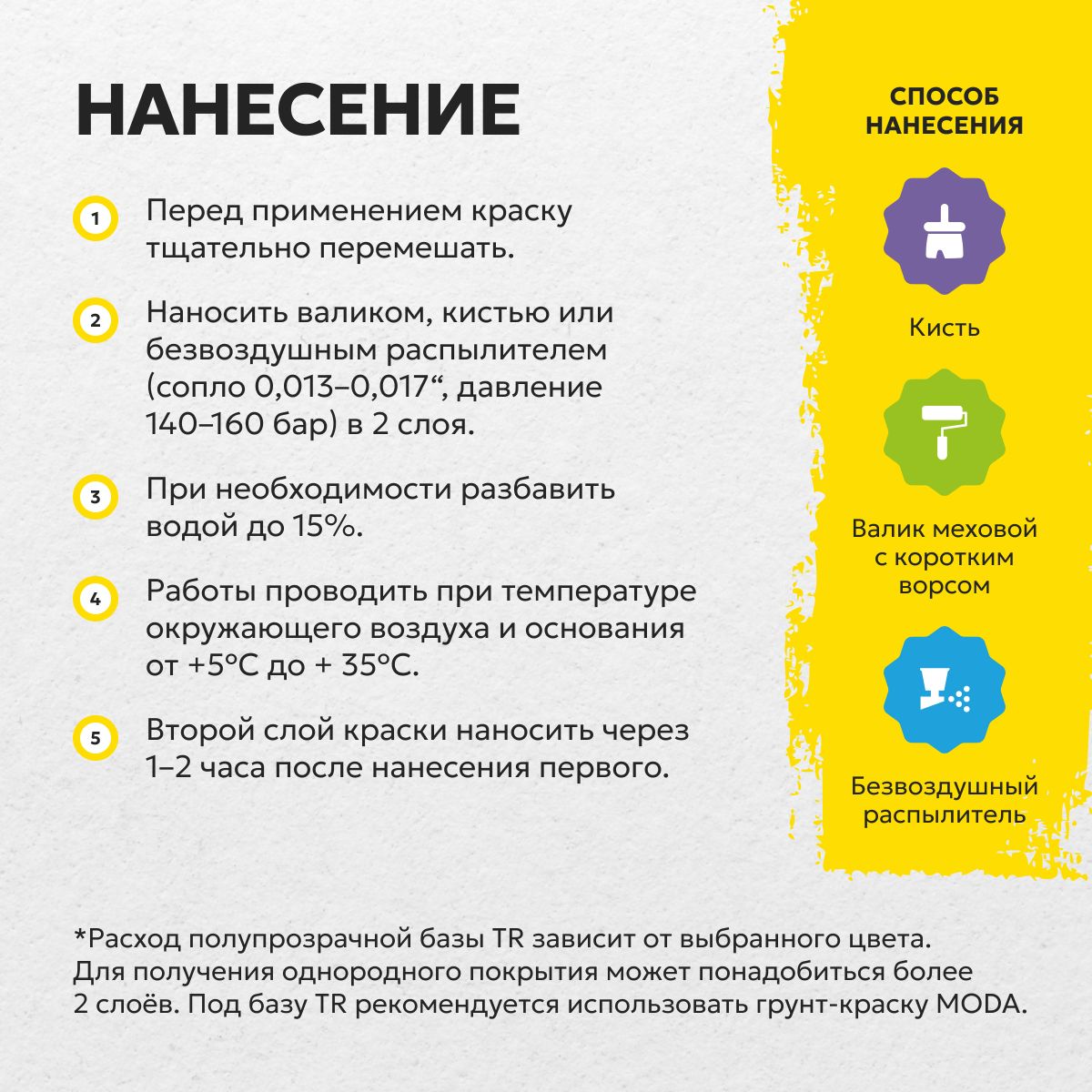 10–13 м²/л на один слой. Расход зависит от типа и подготовки поверхности и способа нанесения. Расход полупрозрачной базы TR зависит от выбранного цвета, для получения однородного покрытия может понадобиться более 2 слоев. Реальный расход определяется пробным выкрасом Время высыхания