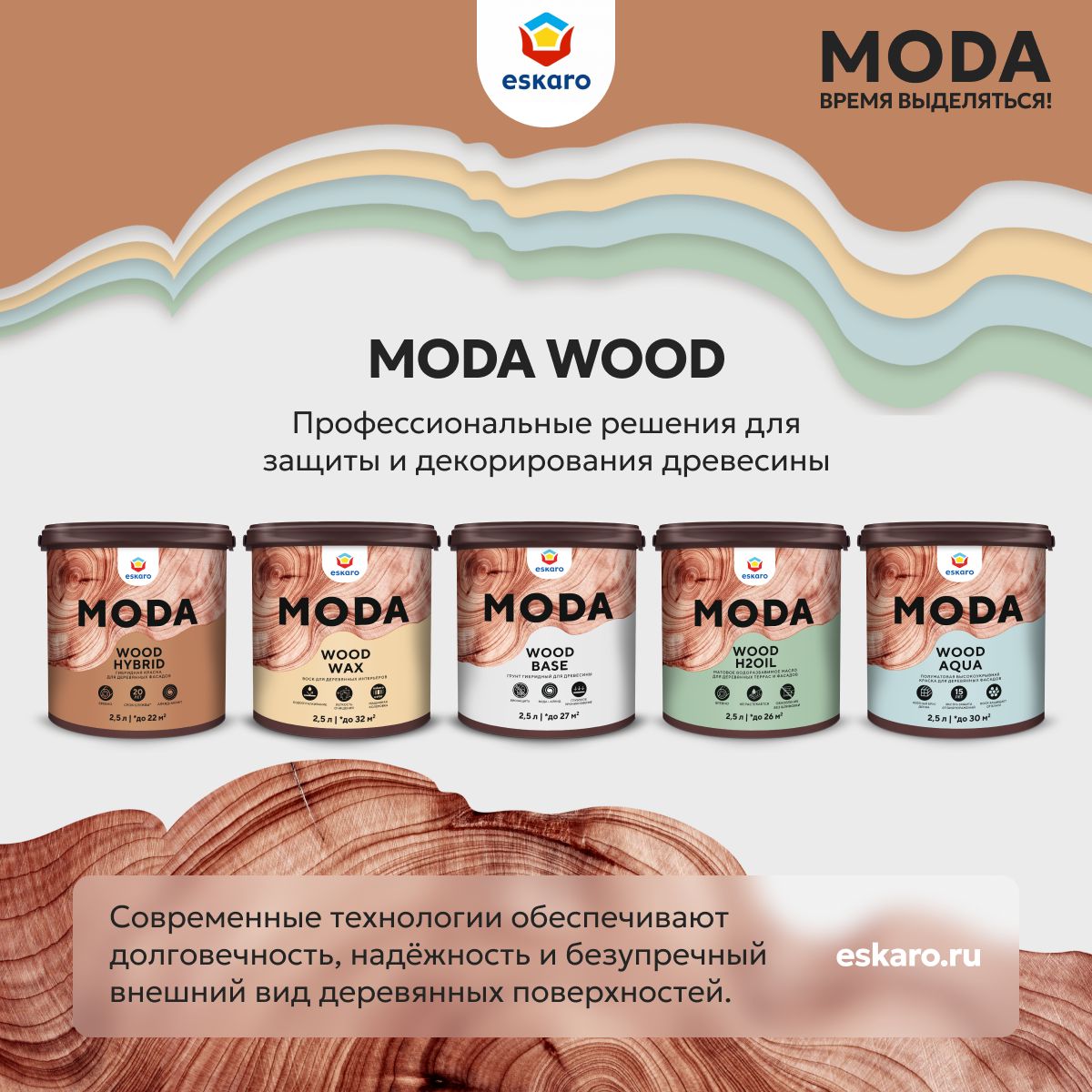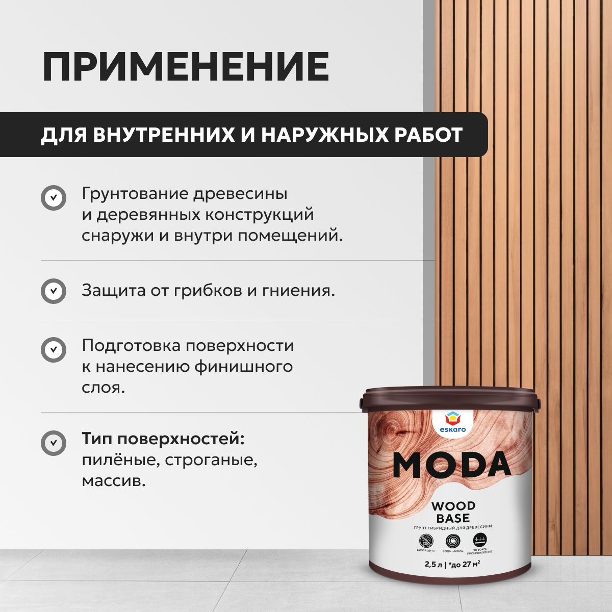 Комплексное использование гибридного грунта Eskaro Moda Wood Base, промежуточных и финишных материалов Eskaro обеспечивает долговечность лакокрасочного покрытия.Назначение